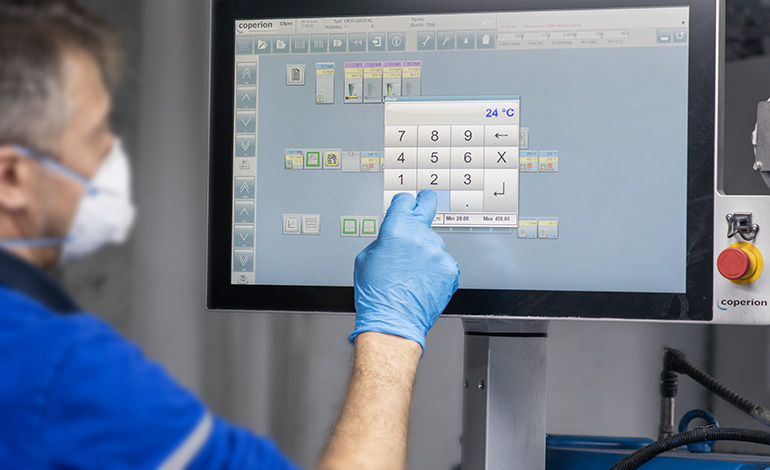 Ekstrüderin kovan ve filtre bölgesi sıcaklıkları ve vida hızı yeni malzemeye göre ayarlanır.