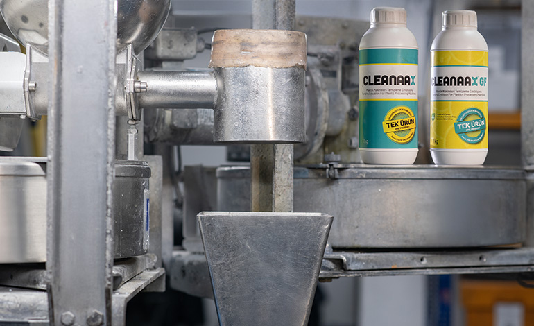 Ekstrüdere gireceğiniz yeni granüllerin içine %3-%4 oranında CLEANAAX® veya CLEANAAX®GF iyice karıştırılır. Karışım miktarı için VİDA ÇAPI/KARIŞIM MİKTARI tablosuna bakınız.